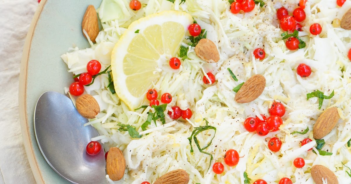 Salade chou blanc, groseilles, sauce amande-citron (salade, cru, amap, vegan)