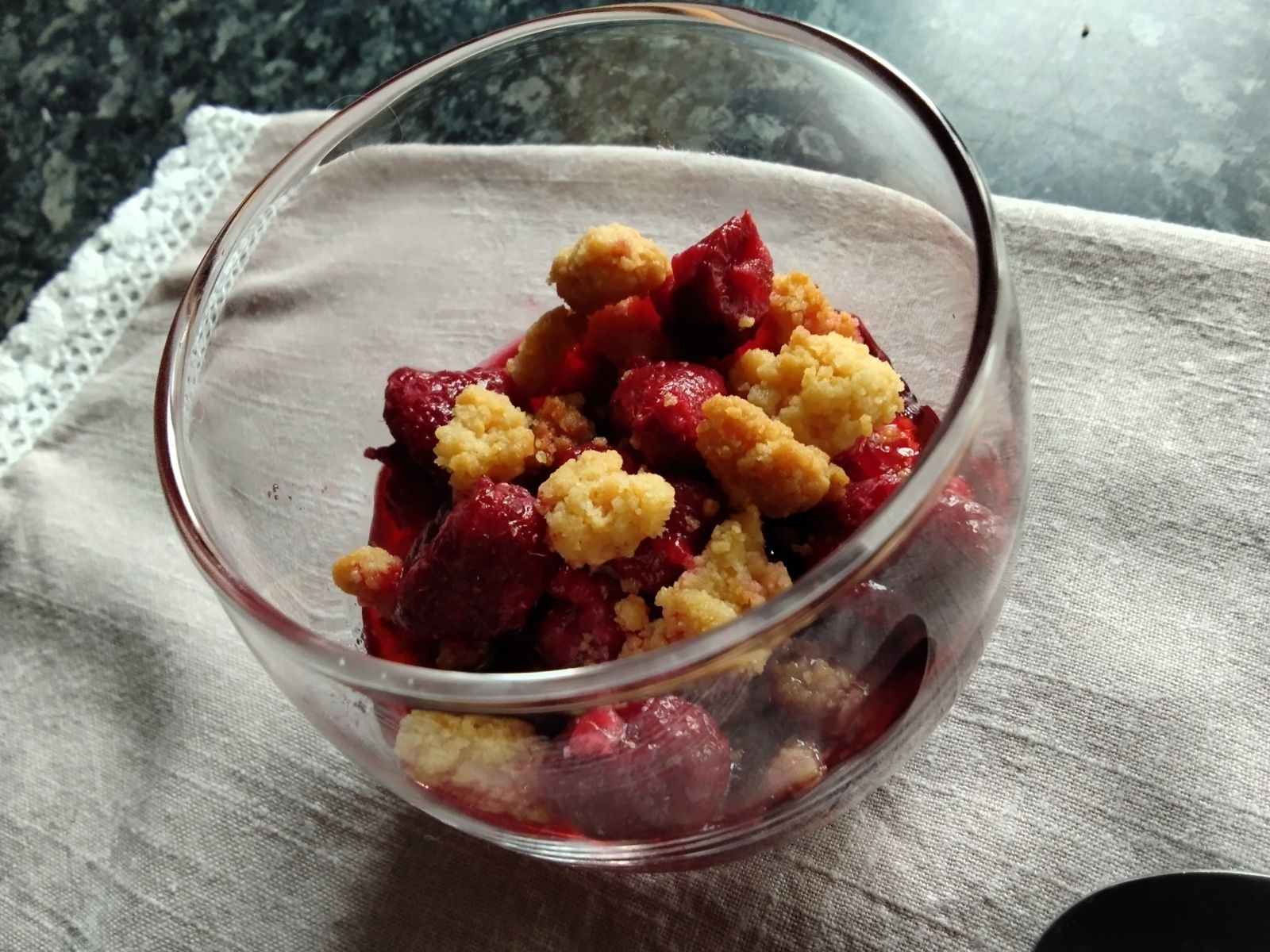 Pour 4 personnes Temps de préparation : 15 minutes Temps de cuisson : 15 à 20 minutes Ingrédients : 800 g de framboises 2 cuillères à soupe de sucre Pour le crumble : 100 g de farine 50 g de sucre en poudre 50 g de cassonade 100 g de beurre en morceaux.