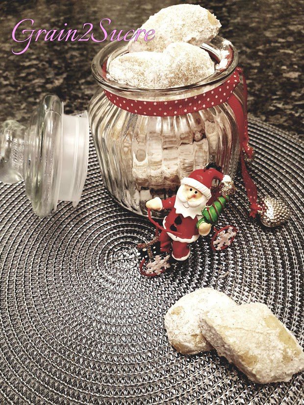 A déguster sans modération ! Ingrédients : 35 g de sucre 1 gousse de vanille 120 g de beurre mou 140 g de farine 60 g d'amandes en poudre 1/2 càc de vanille liquide Pour la finition : 60 g de sucre glace 2 sachets de sucre vanillé Préparation : Préchauffer.