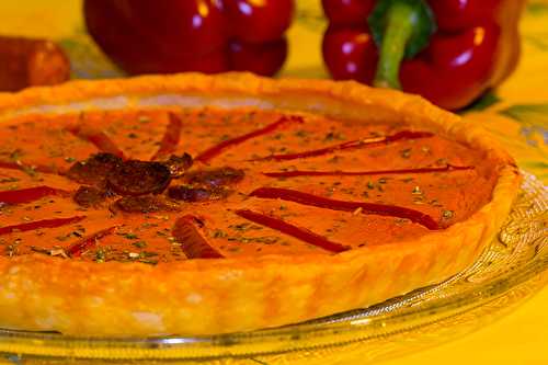 Une tarte au flan de poivron et au chorizo parfumée avec une délicieuse huile d'olive Goût à l'Ancienne des Huiles d’olives du Midi de la France pour