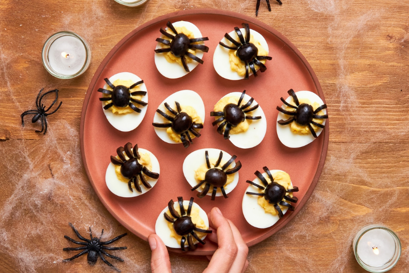 Une idée amusante et effrayante pour Halloween ! Ces œufs farcis, décorés comme des petites araignées, sont parfaits pour impressionner vos invités.