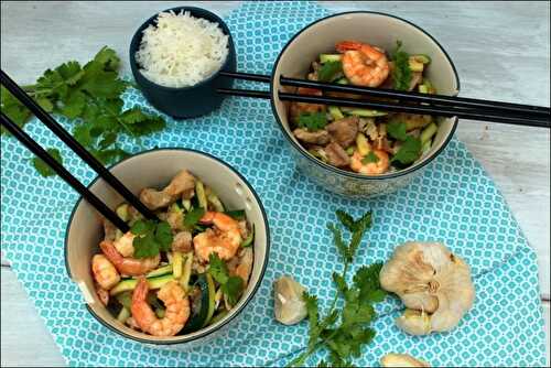 Ce wok de porc aux crevettes et langoustines constitue un bel exemple d'association terre et mer et de la cuisine vietnamienne