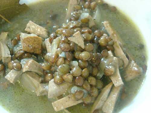 Andouillette aux lentilles vertes Ingrédients : 1 andouillette de Troyes, 60g de lentilles vertes, 1 oignon, 1 feuille de laurier, vin.