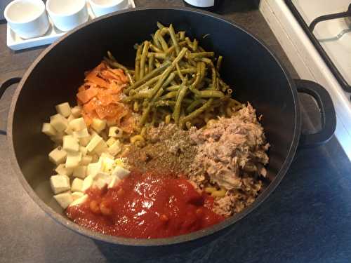 Plein de restes au frigo, je déteste jeter et perdre et bien le One Pot Pasta c'est la solution pour utiliser vos restes! En plus c'est super bon et rapide à faire! Pour 8 gourmands : 500 g de pâtes serpentini 1/2 grosse boîte de thon au nathurel 100.