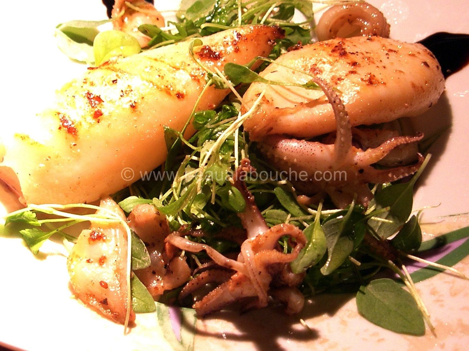 Calamars Grillés sur Salade de Cresson (pour 4 personnes) Ingrédients: 1 kg de calamars entiers (frais ou comme ici surgelés) 120 gr de cresson 1 bouquet de basilic 2 càs d'huile de noisette 1 càs de vinaigre de Xérès 1 mélange de poivre exotique Huile.