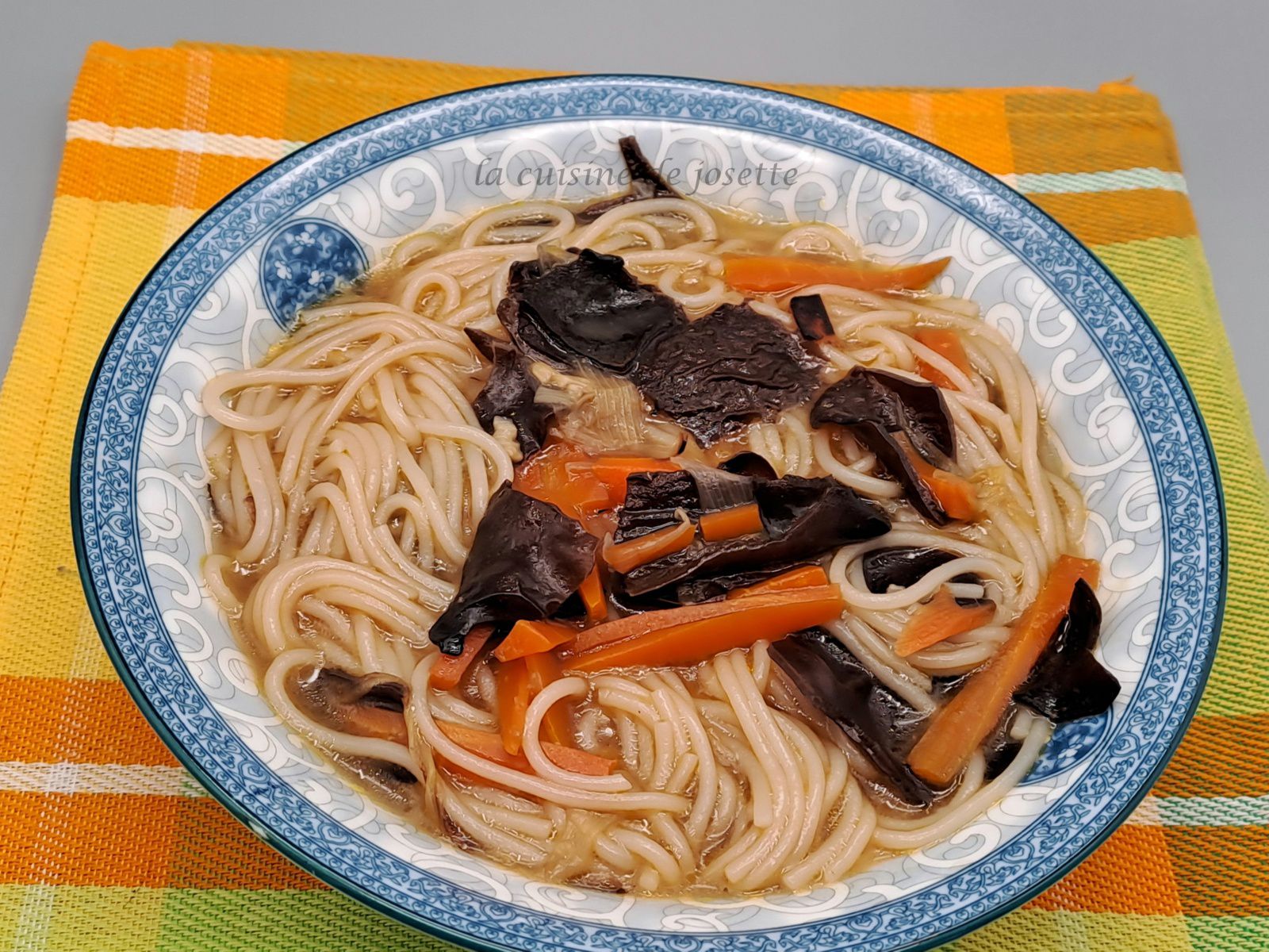 Ingrédients : 4 pers 150gr de nouille chinoise aux riz 25gr de champignons noirs 1 poireau 4 carottes 2 g d'ail 1 et demi de bouillon de légumes(cube) 1c à soupe d'huile de sésame 3c à soupes de sauce soja 1 pincée de gingembre en poudre de la coriandre(pas.