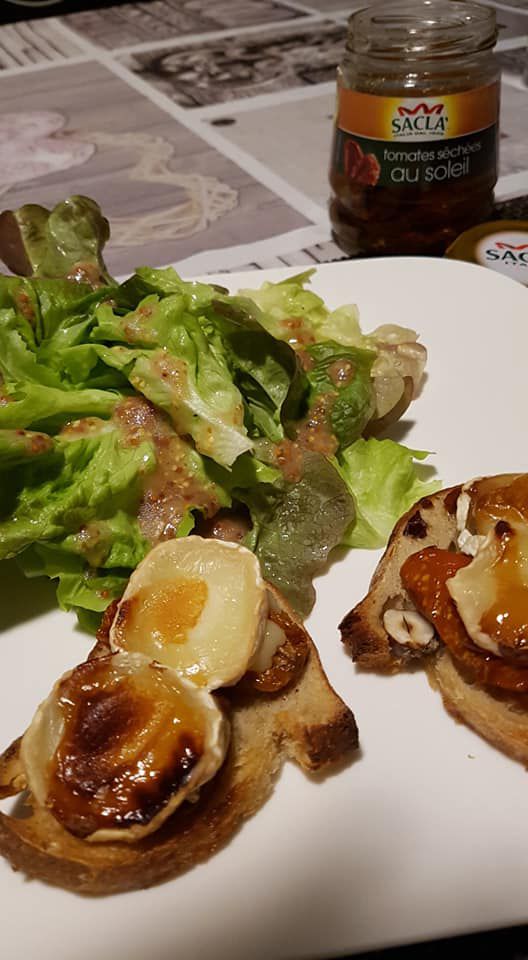 Hier soir, j'ai cuisiné une petite entrée avec ce que j'ai trouvé dans les placards chez ma fille : des toasts aux figues chèvre et miel.