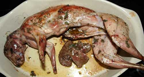 Lapin rôti au romarin Ingrédients : 1 lapin, 20 g de beurre, 50 g de sucre brun, 2 gousses d'ail, le jus d' 1 citron, 20cl de vin blanc,.