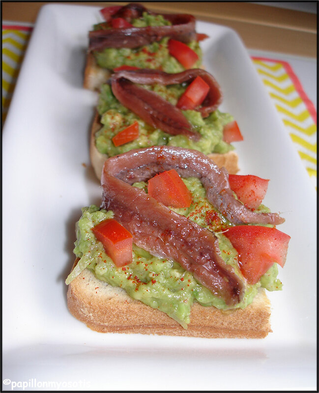 Pan con Tomate aux Anchois Marinés (pour 2 personnes) Ingrédients: 8 à 12 filets d' anchois marinés 3 tomates de taille moyenne ou 2 grosses 4 tranches de baguette 1 gousse d'ail 1 petit oignon rouge Quelques feuilles de basilic Huile d'olive Fleur de.
