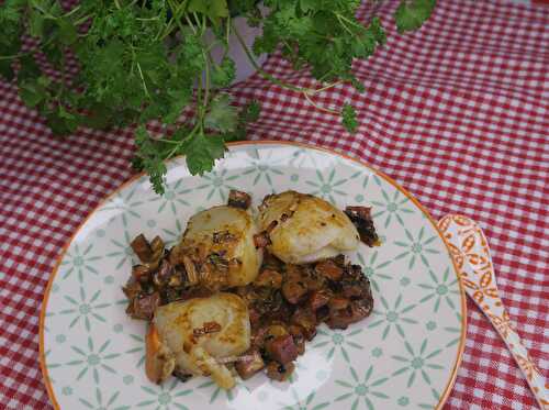 Noix de Saint-Jacques au chorizo et crème Voilà la recette de noix de Saint-Jacques dont je vous avais parlé lors de la publication de ma recette de soupe de lentilles corail au chorizo.