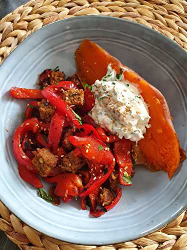 Une p'tite recette sympa et gourmande d'un bol d'automne avec des poivrons rouges et de la patate douce