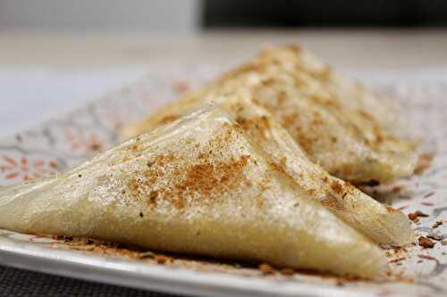 Afin d'obtenir des samoussas tendres plutôt que trop croustillants, il est recommandé d'utiliser deux morceaux de feuilles de brick et de bien plier et serrer les triangles de samoussas.