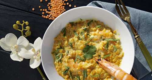 Plat complet d'inspiration indienne à base de lentilles corail et crevettes épicées avec du gingembre, du curry et du curcuma, adoucies par du lait de coco