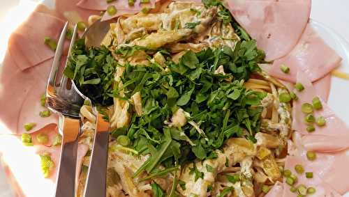 Encore des asperges vertes sur les étals et voilà le déjeuner en route : des oignons nouveaux, de la roquette ciselée, des lamelles de mortadelle pour en faire un plat complet et voilà un plat printanier de pâtes.
