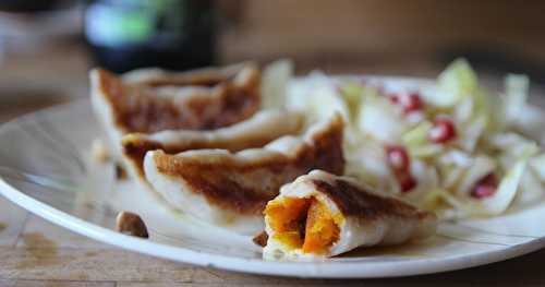 Une entrée légère à servir avec un bon bouillon de poule Pour la pâte à raviolis : 200 g de farine 4 g de sel 90 g d'eau bouillante 20 g de saindoux Pour la farce 250 g de chair de potimarron 2 tranches de jambon fumé 1 c à soupede crème fraiche Parmesan.