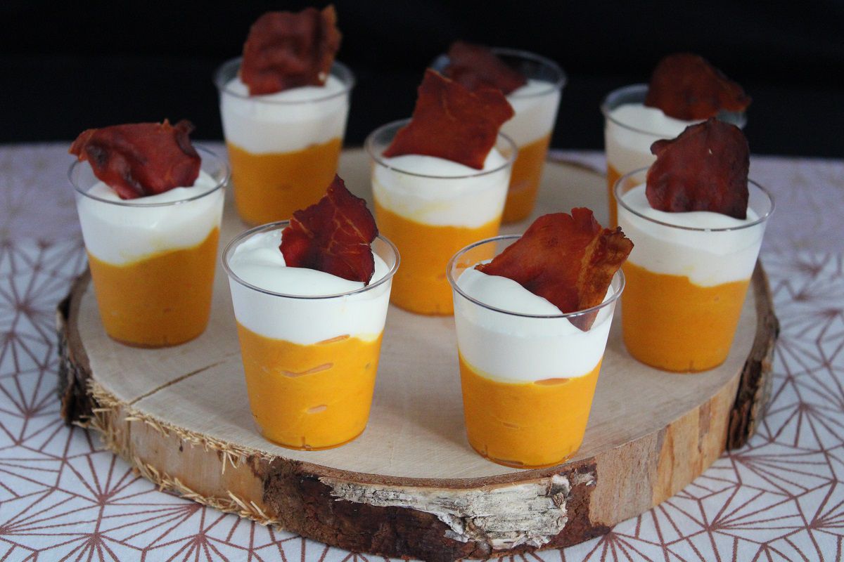 Ingrédients : pour 8 petites verrines 50 g de lait ½ écrémé 150 g de crème fraîche liquide entière 100 g de fromage de Brie (Brie de Melun) 1 pomme et 1 poire 10 g de beurre doux Poivre du moulin Préparation : Peler, enlever le cœur avec les pépins de.