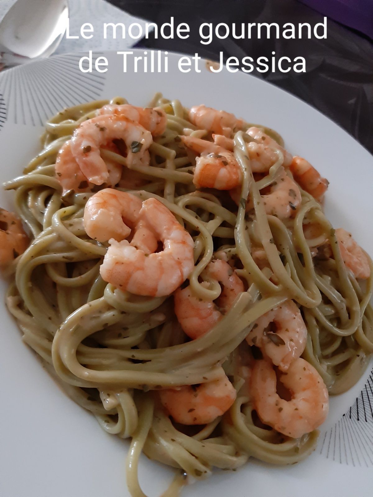 SPAGHETTIS AUX ÉPINARDS CREVETTES À L'AIL Ingrédients pour 4 personnes : 220 g de spaghettis aux épinards 400 g crevettes crues et décortiquées 18 cl de crème fraîche à 4% de mg 3 gousses d’ail 1 cuillère à soupe d’huile 1 feuille de laurier 1 cuillère.
