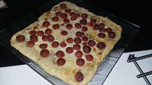Ingrédients (4 personnes): Pâte pour 2 pizzas moelleuse 500 gr de farine 50 gr d'huile d'olive 1 sachet de levure chimique 2 cas de sucre 1 cac de sel 250 gr d'eau tiède 100 gr de babybel 4 saucisses de Strasbourg sauce tomate maison origan basilic Préparation:.