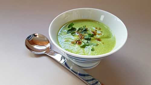 350g de petits pois cuits ½ concombre 10 feuilles de menthe fraiche 200mL de lait de coco 250mL d'eau froide Mixer le tout au blender.
