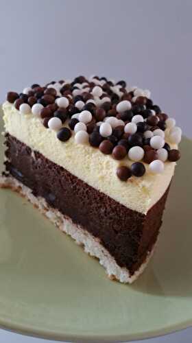 Bavarois aux 3 chocolats avec Thermomix, recette d'un délicieux entremet facile et simple à faire, à base d'une génoise au cacao une mousse au chocolat noir, une mousse au chocolat au lait et une mousse au chocolat blanc.