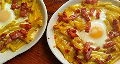 Œufs cocotte façon carbonara Cette recette simple, rapide, et on retrouve bien le goût des carbo même si j’ai utilisé des coquillettes.