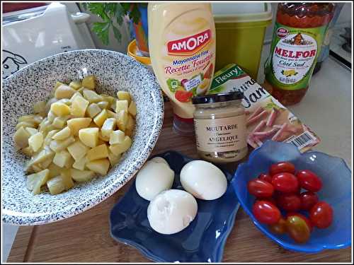 Pour faire venir le soleil et peut être le garder une bonne salade piémontaise faite maison çà vous tente ?? 4 pommes de terre cuites à l'eau 4 tomates 4 œufs durs dès de jambon persil et ciboulette du jardin (facultatif) Mayonnaise maison Sel de Guérande.