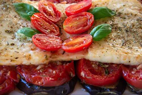 Des tranches d’aubergines et de tomates grillées surmontées de fromage Halloumi, le tout doré à la plancha.