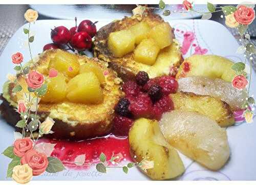 Ingrédients 2 pers: 1 grosse pomme golden 1 grosse poire des cubes d'ananas des fruits rouges surgelés 25cl de lait 2 œufs 50gr de sucre blanc de canne bio ou du sucre normal 1cc de sucre vanillé maison ou 1 s de sucre vanillé du commerce 40gr de beurre.