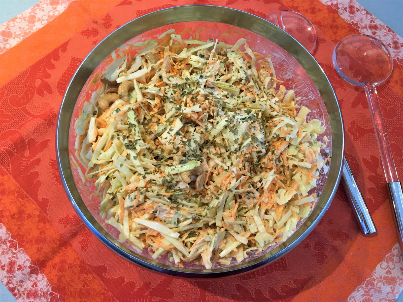 Présentation de la salade Coleslaw au chou blanc et carottes râpés.
