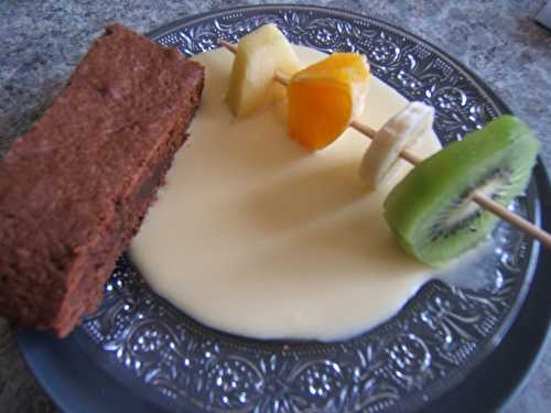 Voici un dessert agréablement rafraîchissant, le chocolaté du brownies arrosé de crème anglaise associé à une brochette de fruits frais.