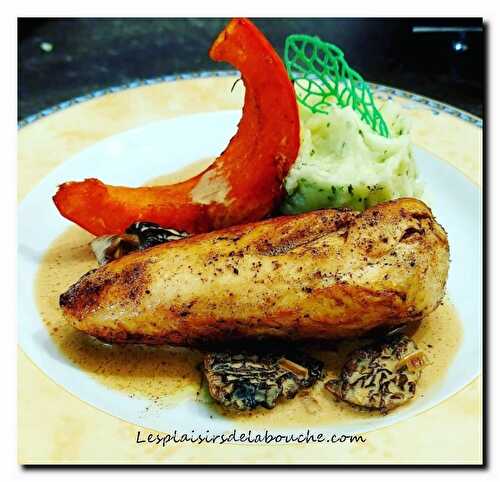 Recette N° 970 Suprême de poulet sauce aux morilles, potimarron rôti et écrasé de pomme de terre Recette bientôt .