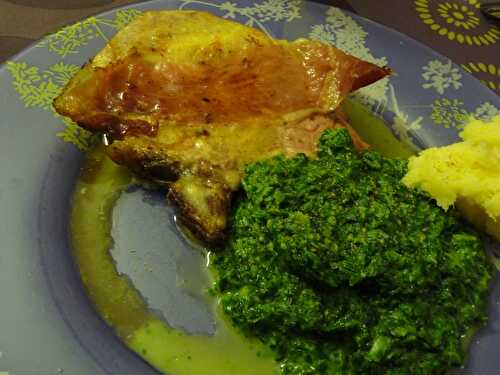 Côte de Porc Farcie en Croûte d'Herbes Sauce au Parmesan (pour 4 personnes) Ingrédients: 4 côtes de porc 2 tranches de jambon cuit 4 tranches de fromage à Croque-Monsieur 1 bouquet d'aneth et de persil 3 gousses d'ail 3 càs de chapelure ou panure 80.