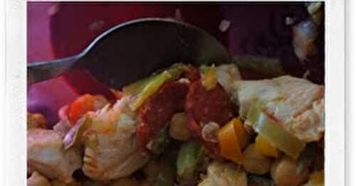 Pour 4 personnes Ingrédients : - 2 blancs de poulet - 1 oignon et 1/2 gousse d’ail - 300g de poivrons surgelés - 25ml d’huile d’olive - 15.