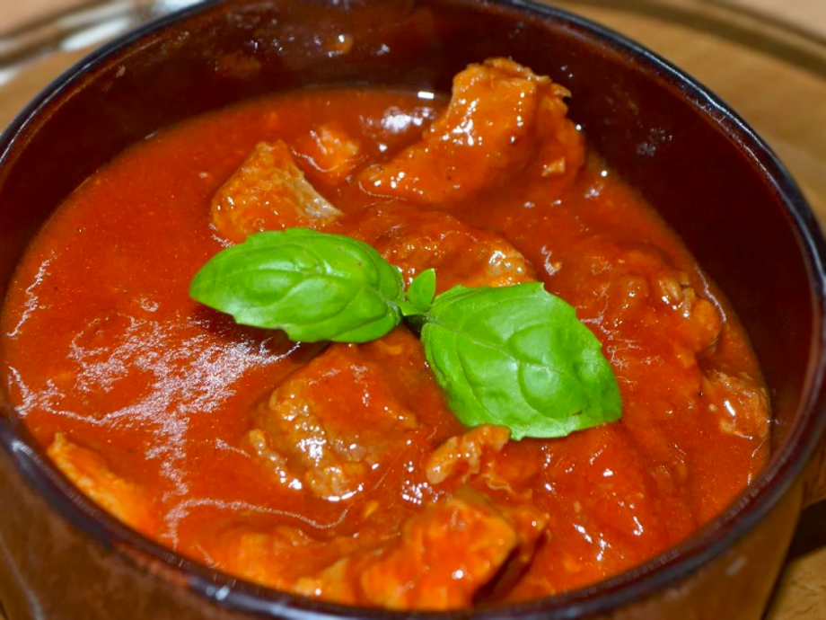 Ragoût de Bœuf Sauce Tomate & Poivrons (pour 5 personnes) Ingrédients : 1 kg de ragoût de bœuf ( cou, filet d’épaule, couvert d’épaule, gras d’épaule, poitrine, flanc, tranche carrée) 700 gr de passata de tomates 1 poivron vert et rouge 1 oignon 2 tomates.
