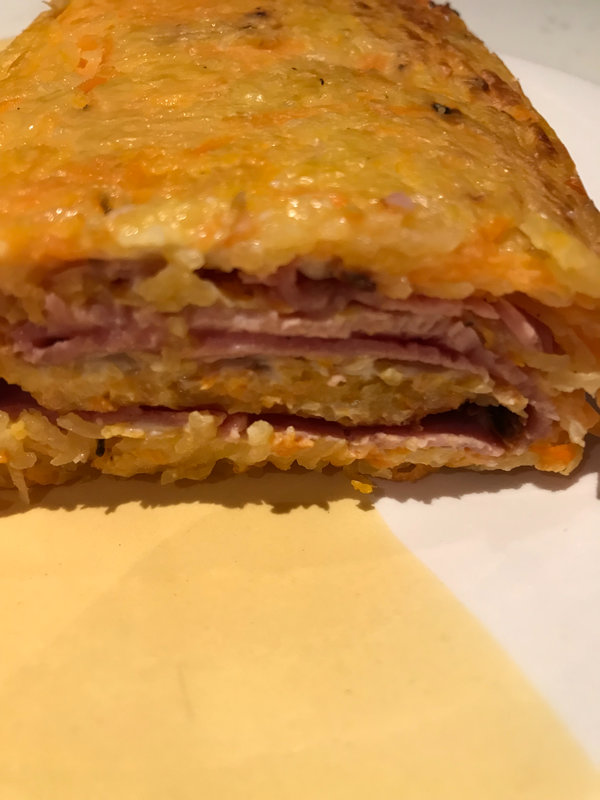 Recette réalisée part anbdré Ingrédients : 550g de pomme de terre crue 1 oignon 2 oeufs 100g de gruyère râpe 6 tranches de jam bon Fromage rapé ou boursin ou kiri ou maroilles ou fromage racelette… sel.