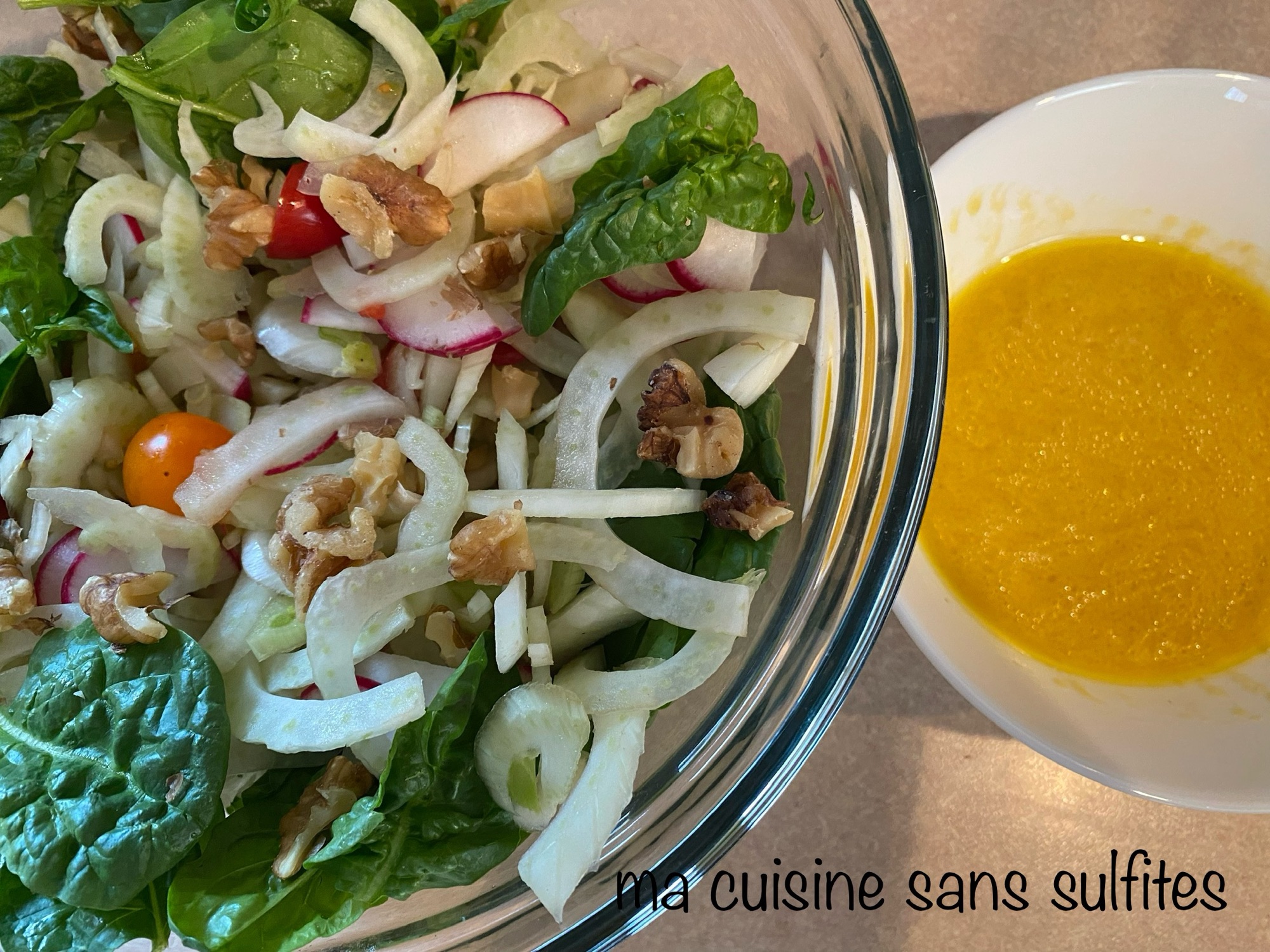 Voici une vinaigrette sucrée salée très sympa particulièrement avec de la mache (et c’est le moment pour en manger).