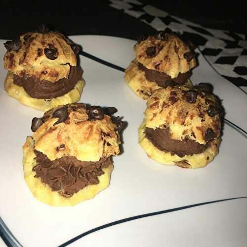 Ingrédients: CHOUX: 1/4 litre d'eau 200 gr de farine 100 gr de beurre 1 pincée de sel 4 œufs pépites de chocolats GANACHE 100 gr de chocolat 50 gr de beurre 120 gr de crème liquide fève tonka Préparation: CHOUX : Mettre l'eau, le beurre et le sel dans.
