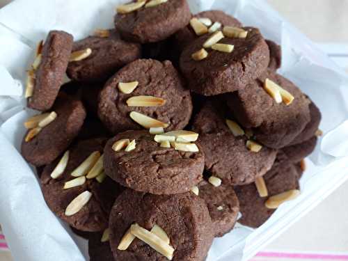 Ingrédients : entre 30 et 35 sablés recette réalisé au thermomix 100gr de chocolat noir en morceaux 50gr de chocolat au lait en morceaux 170gr de sucre cassonade 150gr de beurre demi-sel 175gr de farine 30gr de cacao en poudre 1cuillère à café de bicarbonate.