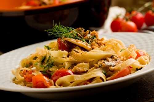 Sardines farcies frites, ou plus précisemment, des filets de sardines farcis et frits avec leur fondue de tomate sur un lit de pennes pour accompagnem