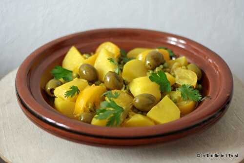 J'aime beaucoup cuisiner ce genre de plats où tout cuit dans un seul plat ! J'ai fait un tajine de poulet avec des pommes de terre et des petits pois .