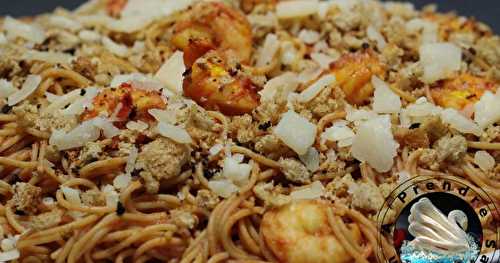 Spaghettis aux crevettes (pas à pas en photos) Une façon originale de cuisiner les pâtes avec du pain croustillant et des copeaux de parmesan qui recouvrent une sauce maison aux crevettes épicées.