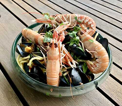 Pour 6 personnes : 1 paquet de pâtes linguines (500 g) 3 belles courgettes 400 g de crevettes cuites décortiquées 20 cl de crème fraîche liquide sel, poivre Laver les courgettes puis les tailler en