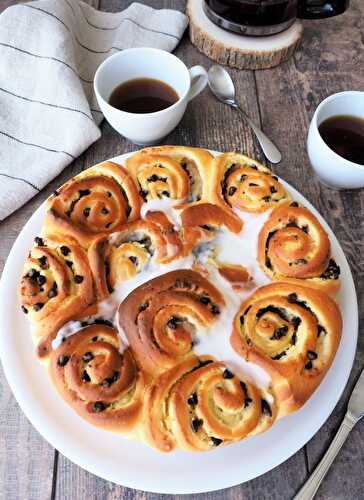 Au bout d’1h30 dégazer la pâte puis former une boule afin de l’abaisser de façon rectangulaire d’une épaisseur d’environ 0,5 mm, après avoir étalé la pâte recouvrir avec la crème pâtissière, bien repartir sur toute la surface (vous pouvez vous aider d’une spatule), puis continuer par ajouter les pépites de chocolat noir. À l’aide d’une spatule rouler votre pâte à partir du côté le plus long une fois que vous avez obtenu un roulé, détailler des tronçons.
