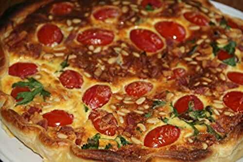 Une recette facile, rapide et savoureuse que vous dégusterez chaude accompagnée d'un mesclin de salades - Sakina - Préparation : 15 min - Cuisson : 30 min - pour 4 personnes - 1 pâte feuilletée toute prête, 1 à 2 tomates, Mozzarella, Champignons, sauce.