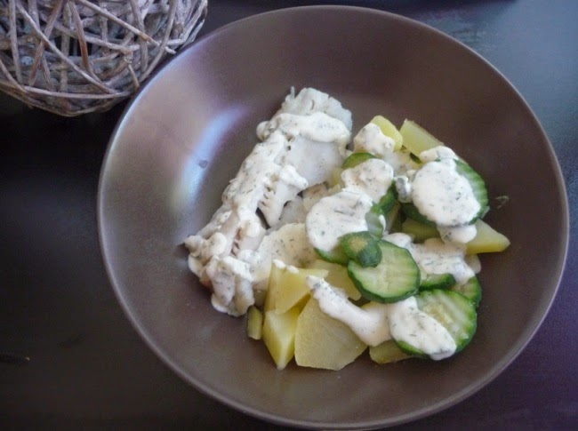 Un repas complet * 3 dos de cabillaud * sel * poivre * curcuma SAUCE: 90 g crème fraîche 250 gramme eau 1/2 cube bouillon de legume 1 c.