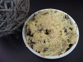 700 g de pâtes cuites (ici spaghettis) 220 g de st Moret (ici allégé) 4 poivrons cornes rouges et verts 170 g de tomme (ici allégée) 5 œufs Chauffer le four à 240°.