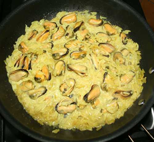 Riz pilaf de moules au curry Ingrédients : 1 litre de moules de bouchot, 60 g de riz basmati, 1 càc de curry de Madras.