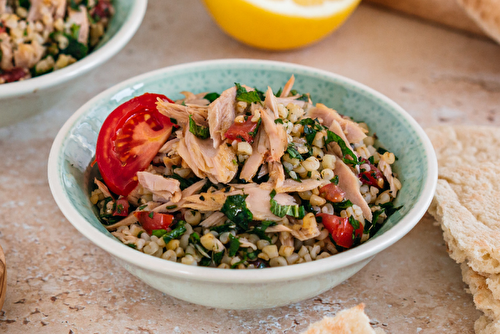 Ingrédients : pour 4 personnes Le taboulé à ma façon 150 g de semoule de blé (grain moyen) 1 belle tomate 2 petits oignons 2 cuillerées à soupe d’huile d’olive Le jus d’un citron jaune pressé Persil et menthe Sel, poivre du moulin Les steaks de thon.