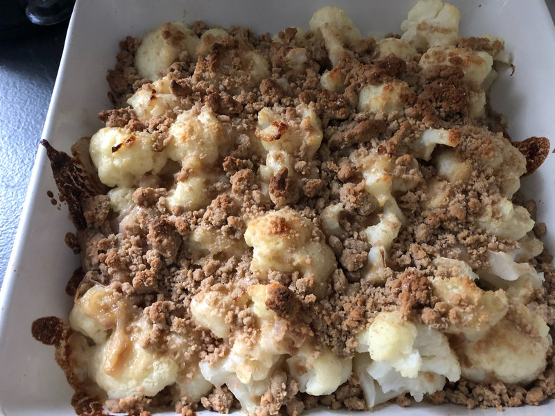 Chou-fleur,Crème fleurette, bouillon de volaille, agar-agar, beurre, poudre d’amande, farine, et crevettes grises, parmesan piment de Cayenne