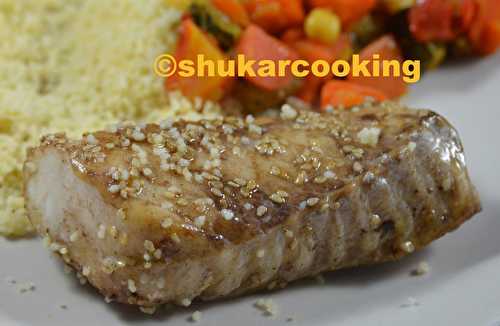 4 dos de cabillaud 2 càs de sirop d'érable 2 càs crème de vinaigre balsamique 1 càs de sauce soja 1 càs de graines de sésame Préparer la marinade : Mélanger le sirop d'érable et la crème de vinaigre balsamique, puis la sauce soja.